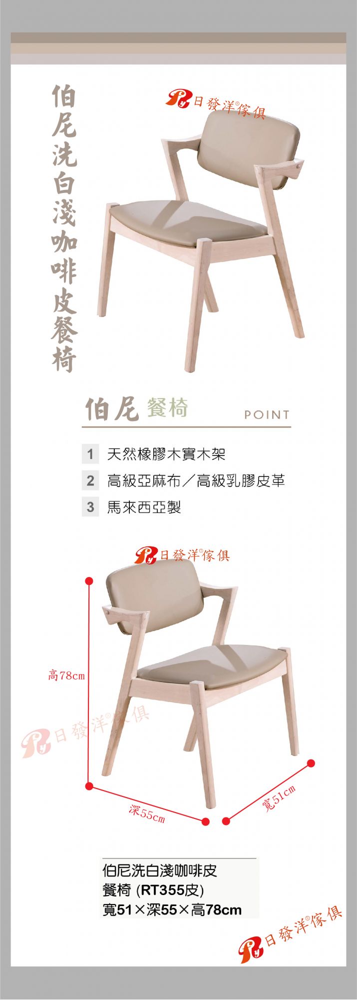 - 品名:A457-04伯尼洗白淺咖啡皮餐椅(皮)
