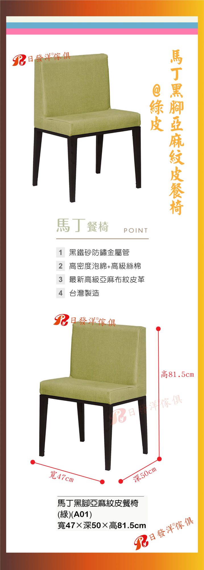 - 品名:A451-02馬丁黑腳亞麻紋皮餐椅(綠皮)