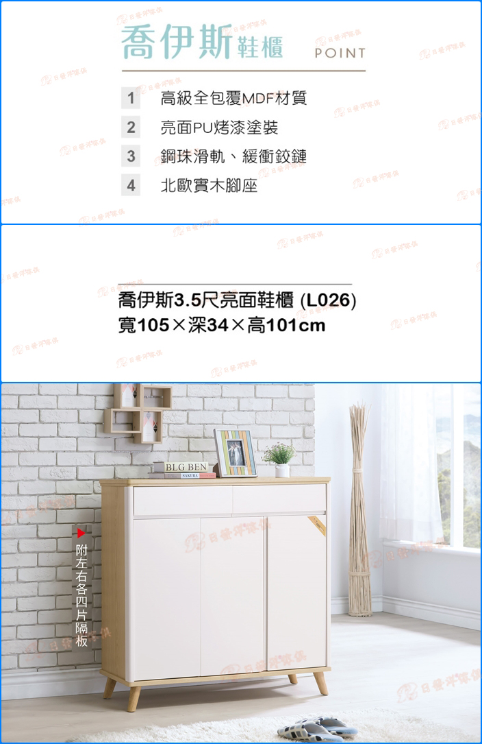 - 品名:A392-02喬伊斯3.5尺亮面鞋櫃