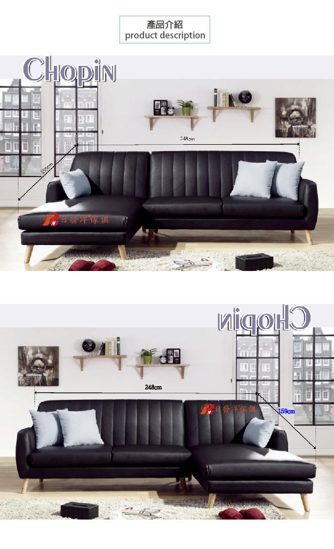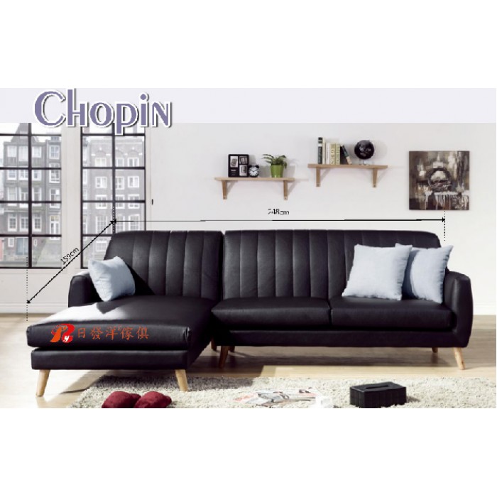 - 品名:W163 布魯克L型黑皮沙發(面左貴妃)